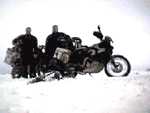 Wednesday 12.7.00 Now we are getting in the swing of it, ready to hit the road at 10 after Municipal breakfast, also very good, we fuelled up and rode out of town past the biggest Ox Cart we've ever seen, and a motocross track, BIG drop-offs, we'd have done a quick lap but with these panniers on you just can't get the bike down in the corners..... We were aiming for Comodoro Rivadavia, the biggest town we'd been to since Punta Arenas. It was another 300k run, but after making good time yesterday we were confident. However the TV crew had said that the weather is unseasonably bad, and places that never have snow are getting it this year, oh well. The road was stunning again, back away from the port and up on the top, the sky was pale blue and with the snow, the colour was just like the Argentine flag. Looking to the left we could see in the far distance the Andes, where our original route would have been. All went well for the first hour, until we encountered a 5 km section of snowbound road, packed down by trucks, and we headed straight for the hard shoulder again. Good decision, as the road was tram-lined, and although you could go along it, a change of speed or direction would have had you off. In fact it was fine, except the very last section where John got cross rutted while looking at the mountains, and couldn't save it. Never mind, only dented pride this time! We pressed on once we'd cleared this section, but we kept climbing and the temperature kept dropping, we rigged a thermometer on the indicator stem, and it was showing -15/-20 at 60mph, well done Rukka & Snugrip again as it was actually warmer on the bikes than stopped trying to film things. We stopped at the only place en-route, Fitz Roy, a filling station, shop and 5 houses, but they had a great collection of Neolithic arrowheads, and pics of cars & trucks wrecked on the local roads! Some what subdued we pushed on, but now climbing over rocky outcrops it was really cold, then suddenly it all dropped away, the temperature went up by 5 degrees and it was a wonderful run down along the Atlantic coast, again quite a stunning view, and we had to stop several times to take it in. We completed the run into Comodoro Rivadavia (GPS S45.51.749/W067.28.587) and all of a sudden we were back in "civilisation", after miles of nothing, traffic jams! We got directions to various different hotels from people, again really helpful and interested in us, lots of waving & smiling, before stopping at the Austral Hotel who have secure parking and Internet, it was bizarre to see our own site from here, with someone else flying it in Spanish, but it did the job and they were again very interested. So another day done and our first 1000 miles completed, though not all in a northerly direction. are aiming to travel to Trelew tomorrow, another 300k, and a Canadian aero engineer tells us that the roads to Buenos Aires are blocked, but we've heard so many different stories we will just go and see! To the sound of Yankee Pickups with no exhausts doing donuts on the ice outside we will try and get some sleep!